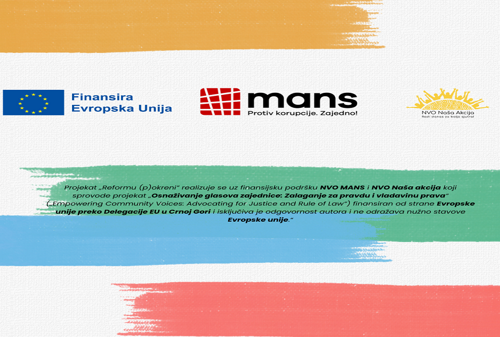 Projekat realizujemo uz finansijsku podršku NVO „MANS” i NVO „Naša akcija”, u okviru konkursa Jačanje transparentnosti i odgovornosti u sektorima pravde i vladavine prava, koja je sprovedena kroz projekat Osnaživanje glasova zajednice: zalaganje za pravdu i vladavinu prava (Empowering Community Voices: Advocating for Justice and Rule of Law) finansiran od strane Evropske unije posredstvom Delegacije EU u Crnoj Gori.