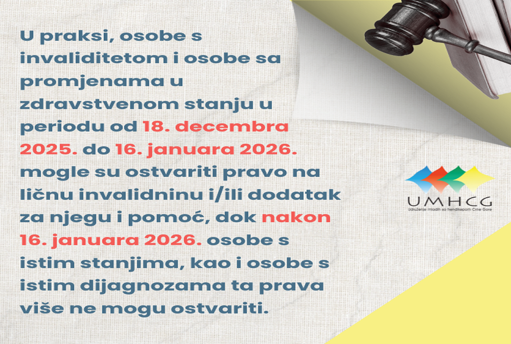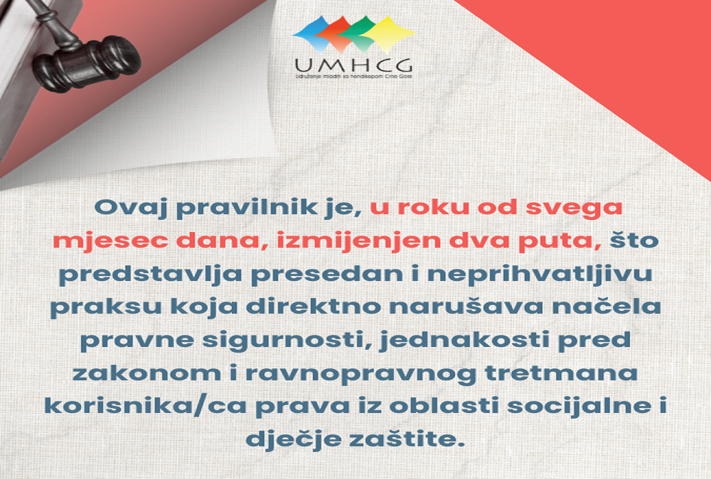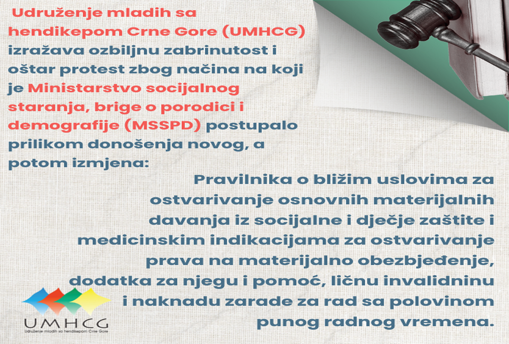 Udruženje mladih sa hendikepom Crne Gore (UMHCG) izražava ozbiljnu zabrinutost i oštar protest zbog načina na koji je Ministarstvo socijalnog staranja, brige o porodici i demografije (MSSPD) postupalo prilikom donošenja novog, a potom izmjena Pravilnika o bližim uslovima za ostvarivanje osnovnih materijalnih davanja iz socijalne i dječje zaštite i medicinskim indikacijama za ostvarivanje prava na materijalno obezbjeđenje, dodatka za njegu i pomoć, ličnu invalidninu i naknadu zarade za rad sa polovinom punog radnog vremena.