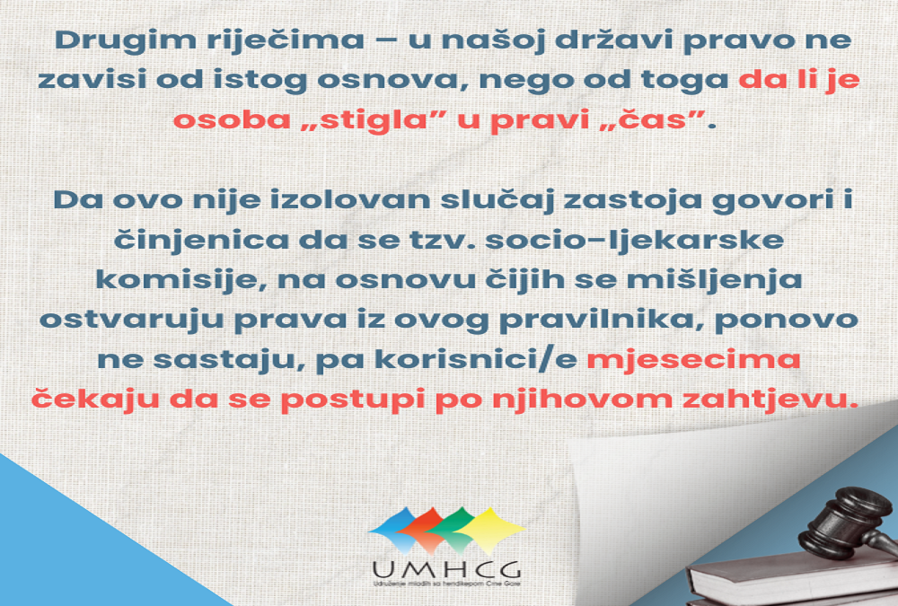 Drugim riječima – u našoj državi pravo ne zavisi od istog osnova, nego od toga da li je osoba „stigla” u pravi „čas”. Da ovo nije izolovan slučaj zastoja govori i činjennica da se tzv. socio-ljekarske komisije, na osnovu čijih se mišljenja ostvaruju prava iz ovog pravilnika, ponovo ne sastaju, pa korisnici/e mjesecima čekaju da se postupi po njihovom zahtjevu.