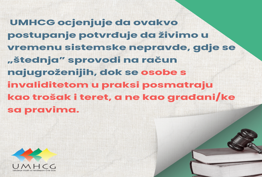 UMHCG ocjenjuje da ovakvo postupanje potvrđuje da živimo u vremenu sistemske nepravde, gdje se „štednja” sprovodi na račun najugroženijih, dok se osobe s invaliditetom u praksi posmatraju kao trošak i teret, a ne kao građani/ke sa pravima.