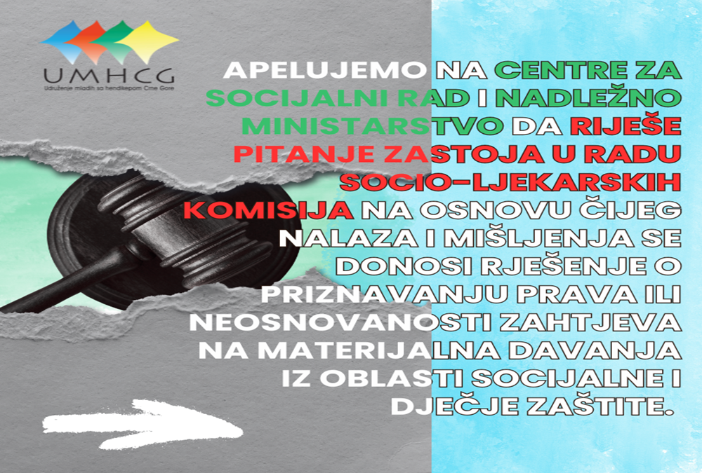 Apelujemo na centre za socijalni rad i nadležno ministarstvo da riješe pitanje zastoja u radu socio-ljekarskih komisija na osnovu čijeg nalaza i mišljenja se donosi rješenje o priznavanju prava ili neosnovanosti zahtjeva na materijalna davanja iz oblasti socijalne i dječje zaštite.